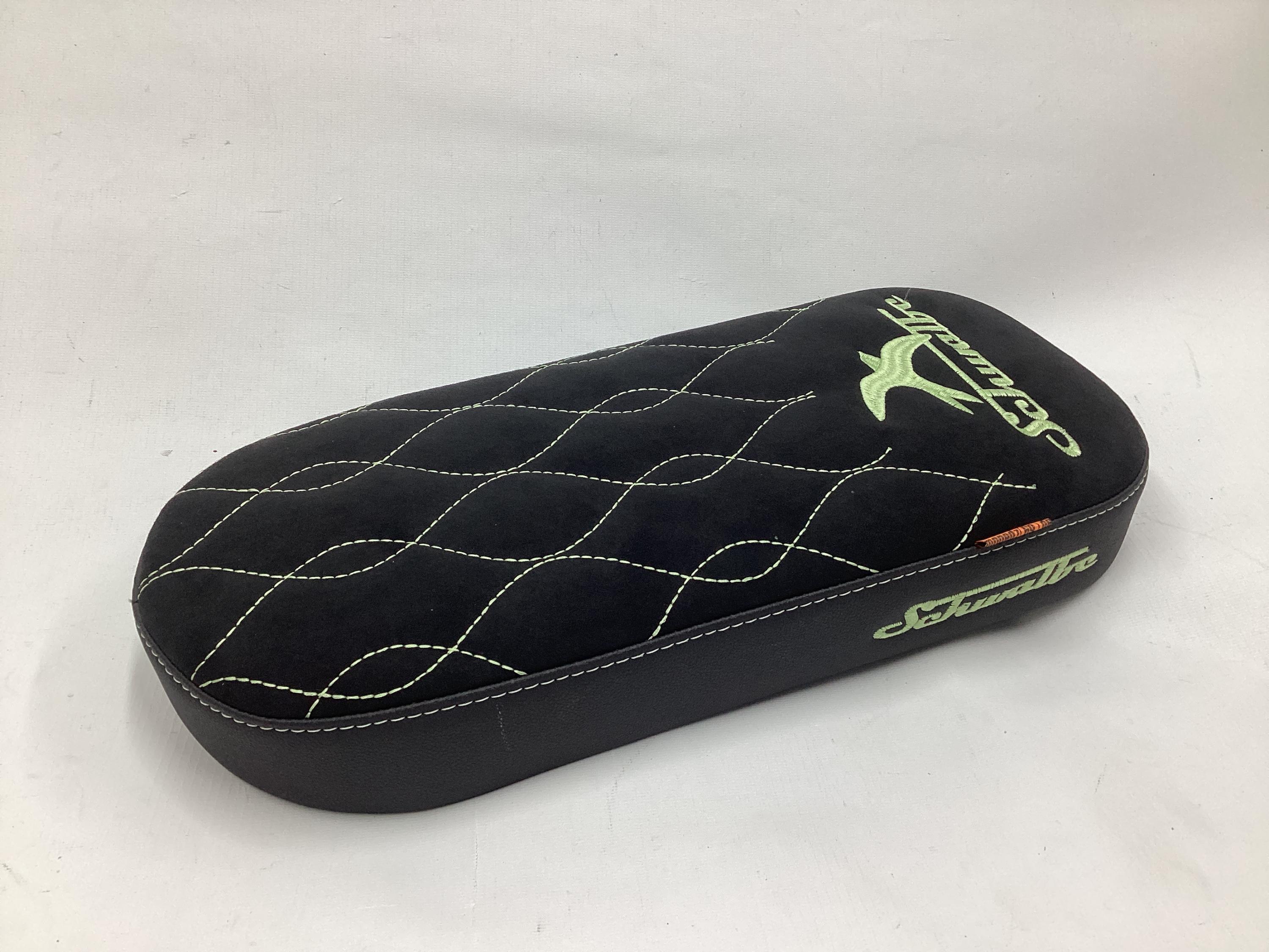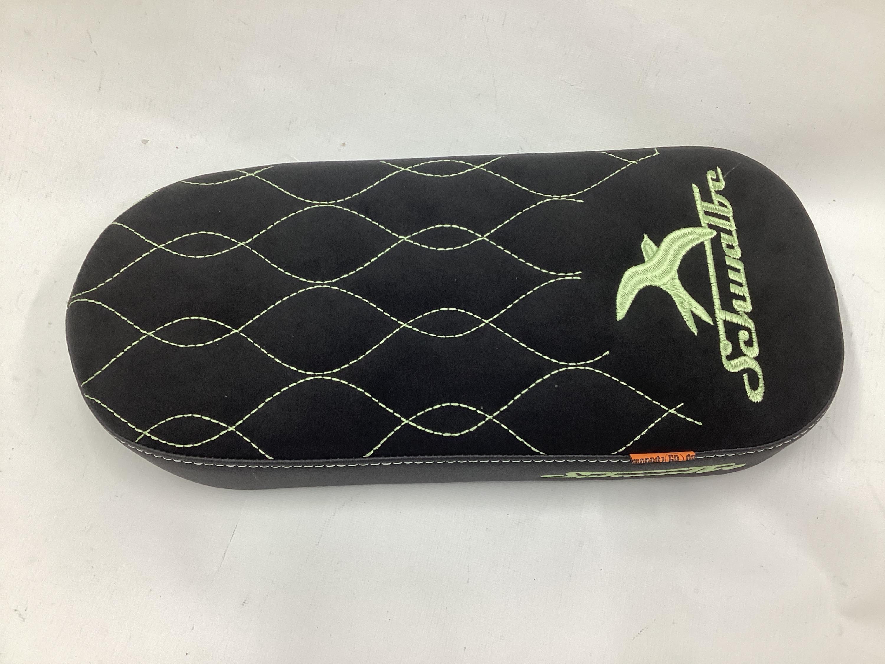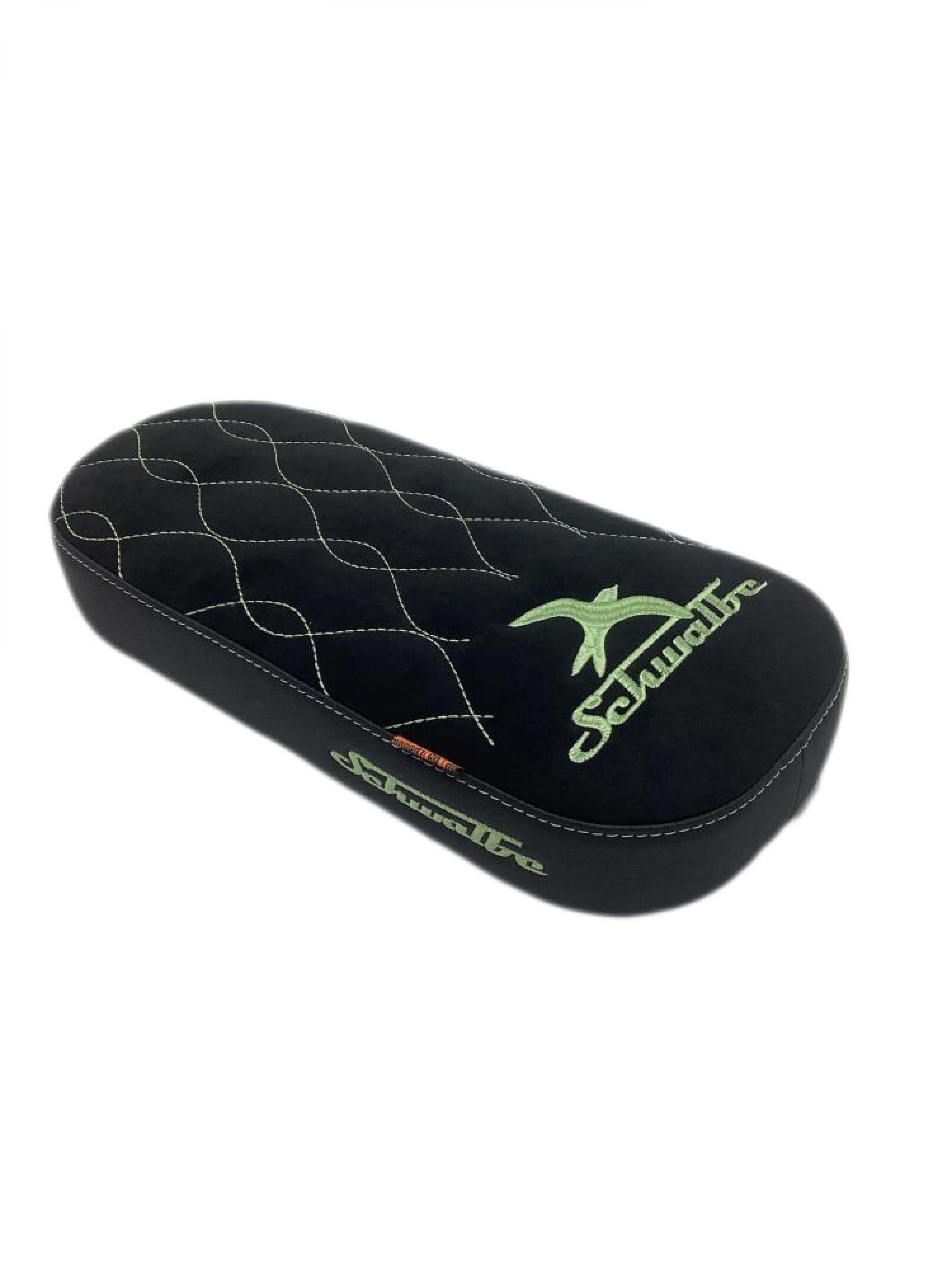 die Sitzfläche wellenförmig gestickt und im hinteren teil befindet sich das Schwalbelogo mit Schriftzug.